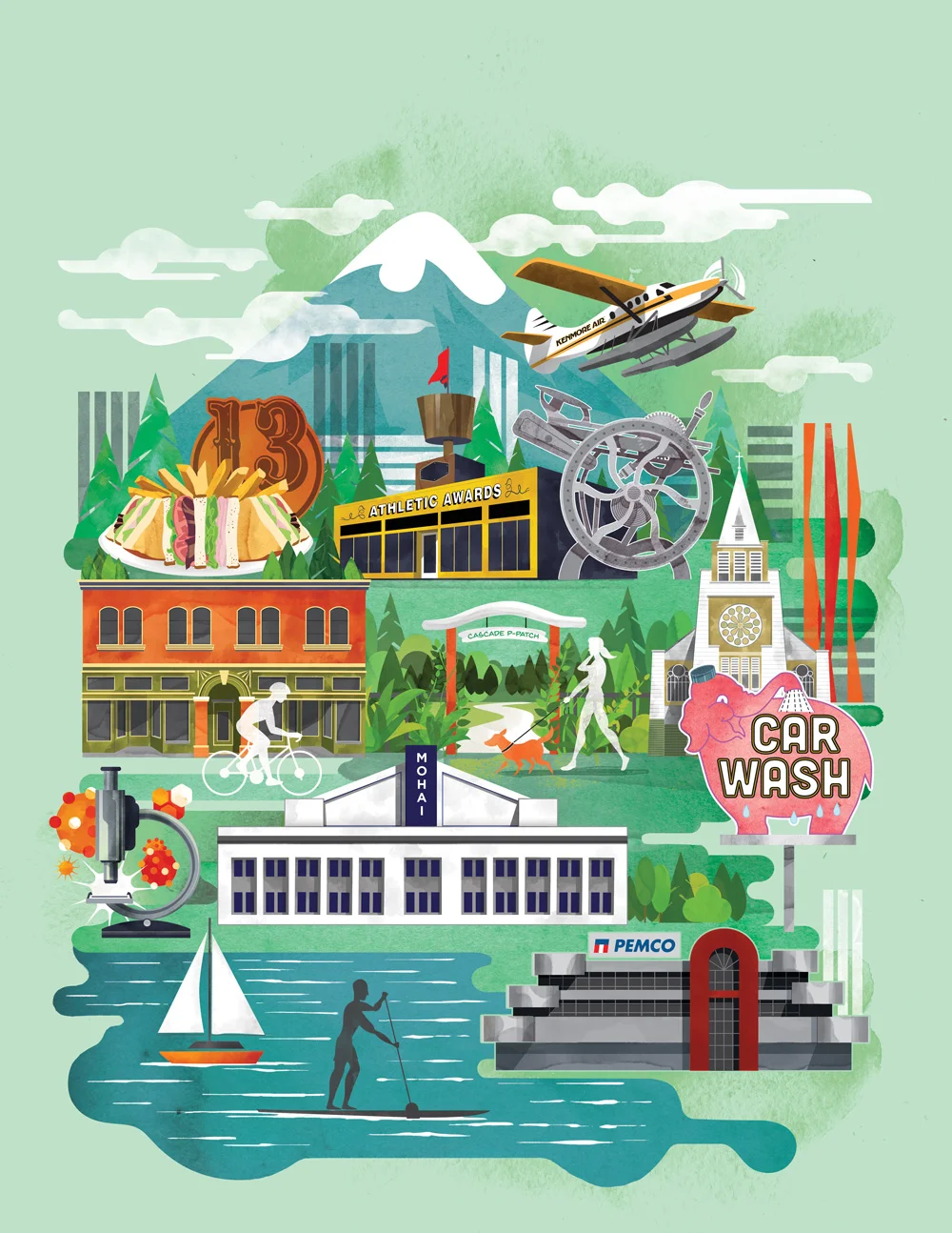 for Seattle Met Magazine, highlighting attractions along regional travel routes.