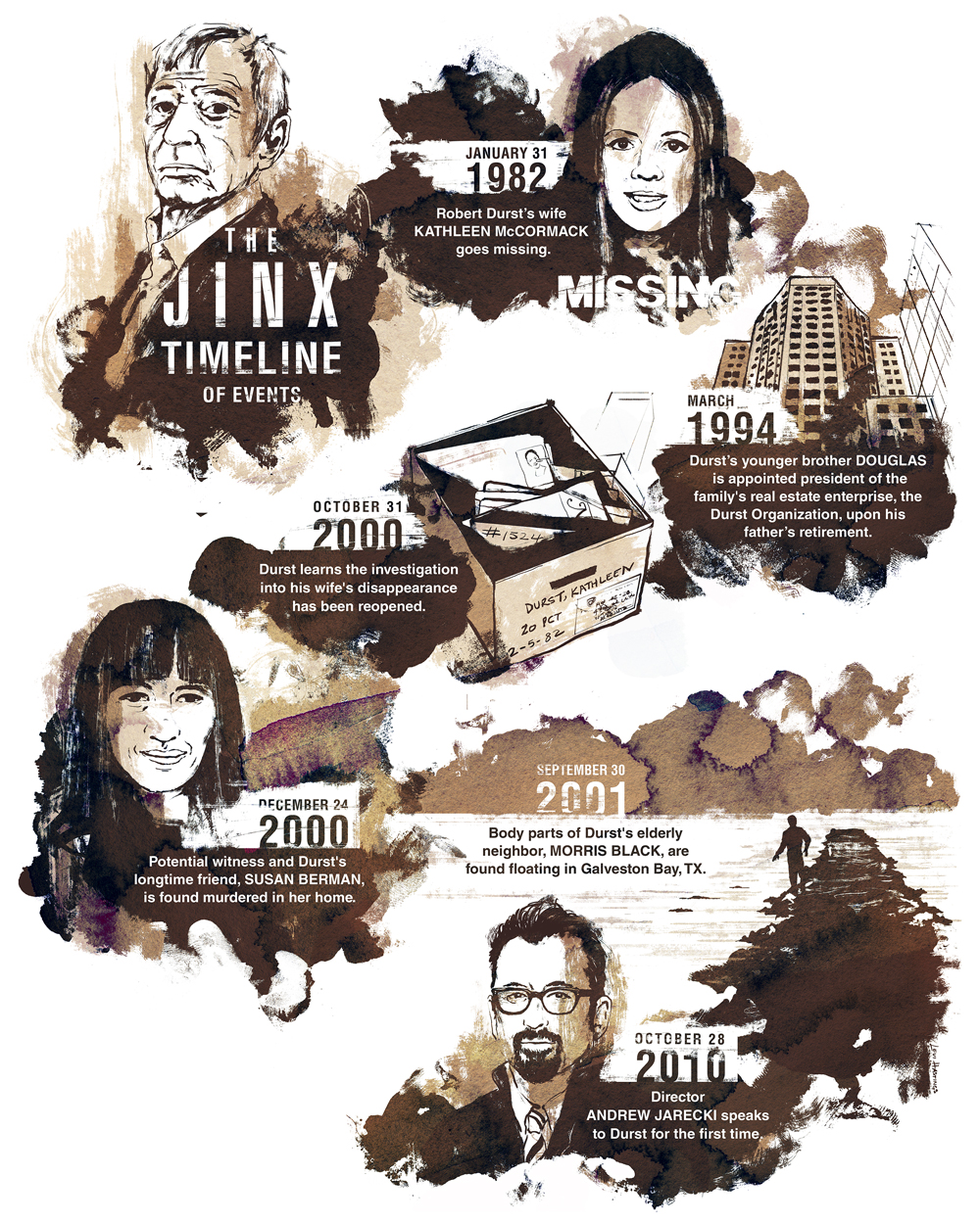 I had another great opportunity to work with HBO Documentary Films creating an illustrated timeline for their new crime series, The Jinx: The Life and Deaths of Robert Durst. If you're at all interested in true crime or got hooked on Serial, this is a truly fascinating show.